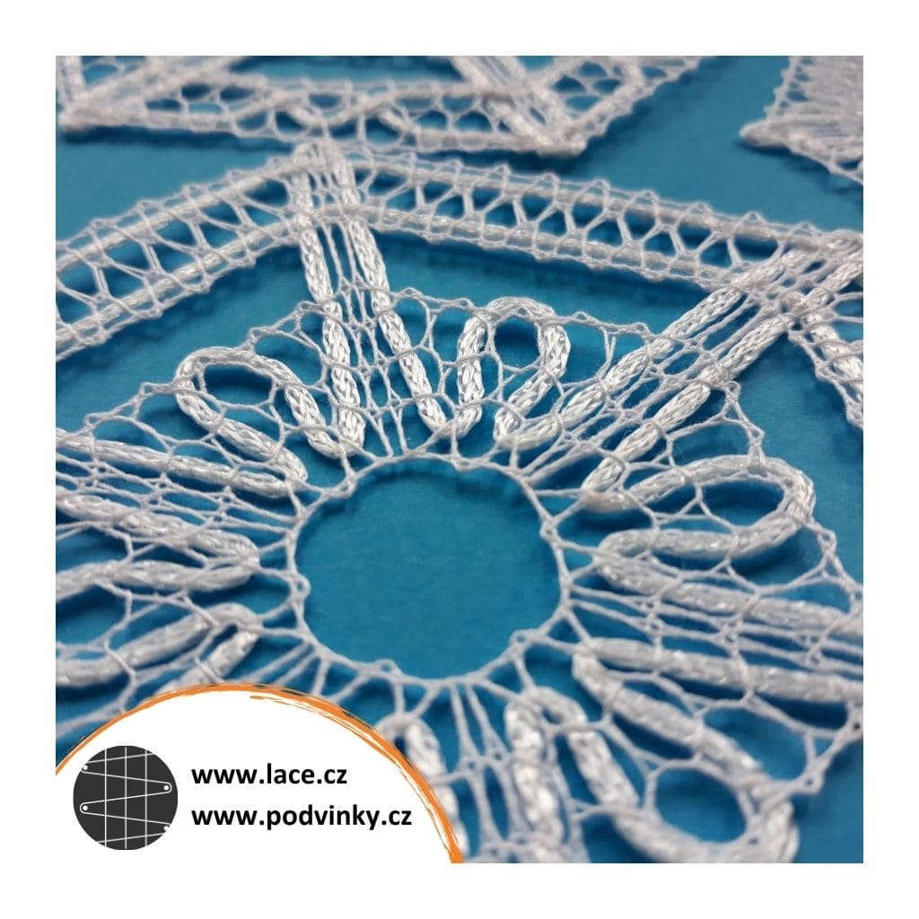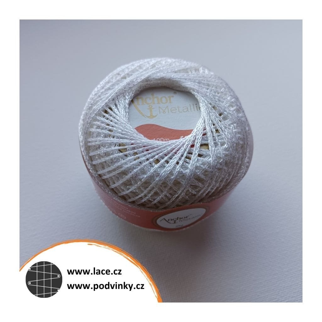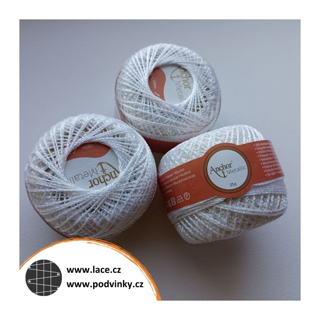Příze Anchor Metallic je primárně určená pro háčkování, ale krajkářkám perfektně poslouží jako kontura (obtahovačka), například pro Ledové krystaly, Ledové krystaly 2, Ledové květy nebo Minikrystaly. Ze stejného materiálu jsou upaličkované také bonusové krystaly 1 a bonusové krystaly 2.