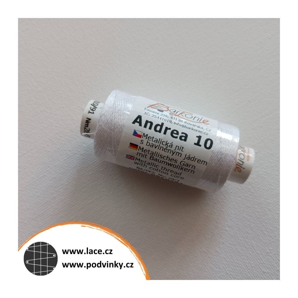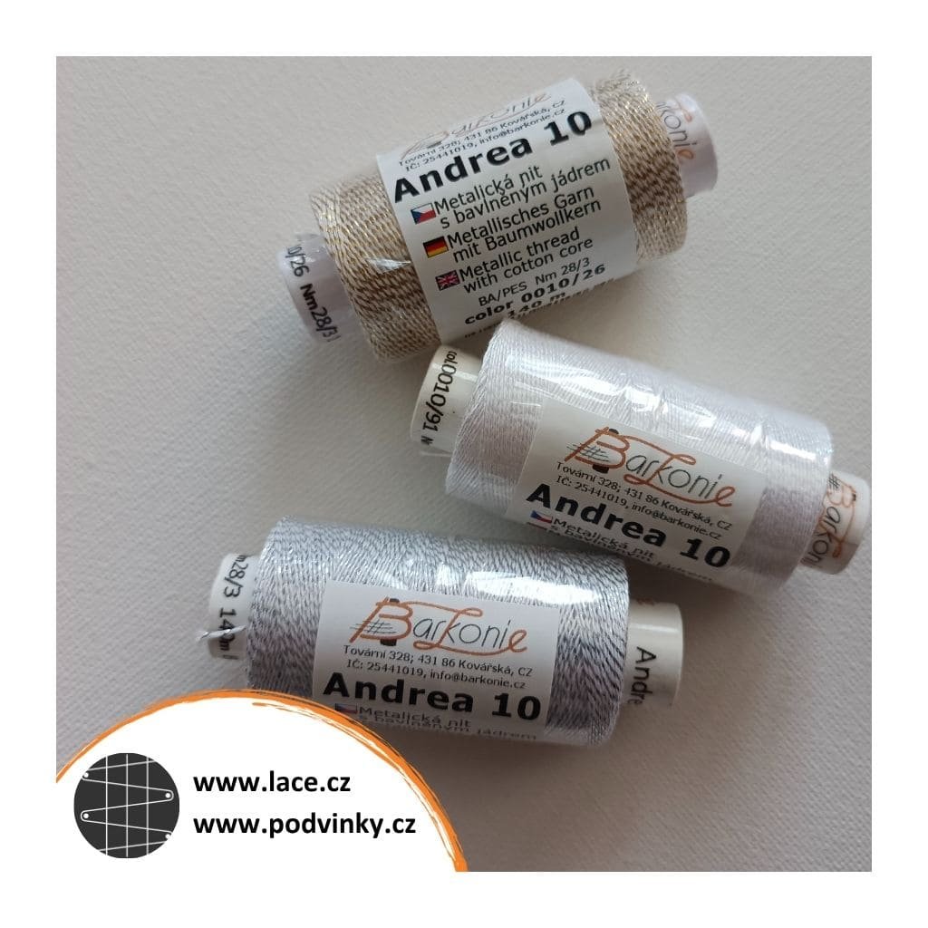 Jedná se o metalickou niť s bílým bavlněným jádrem, BA/PES Nm 28/3. Na jedné roličce je 140 metrů.
