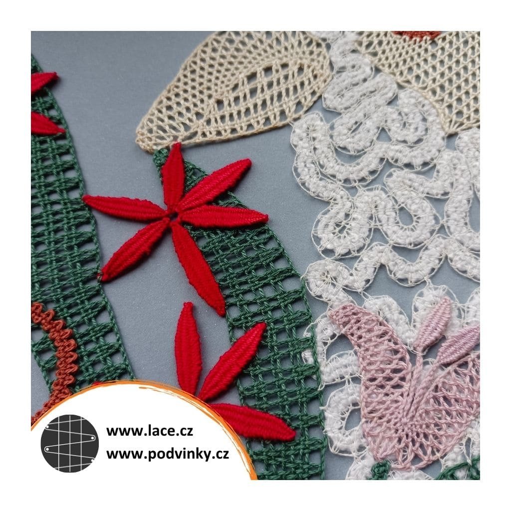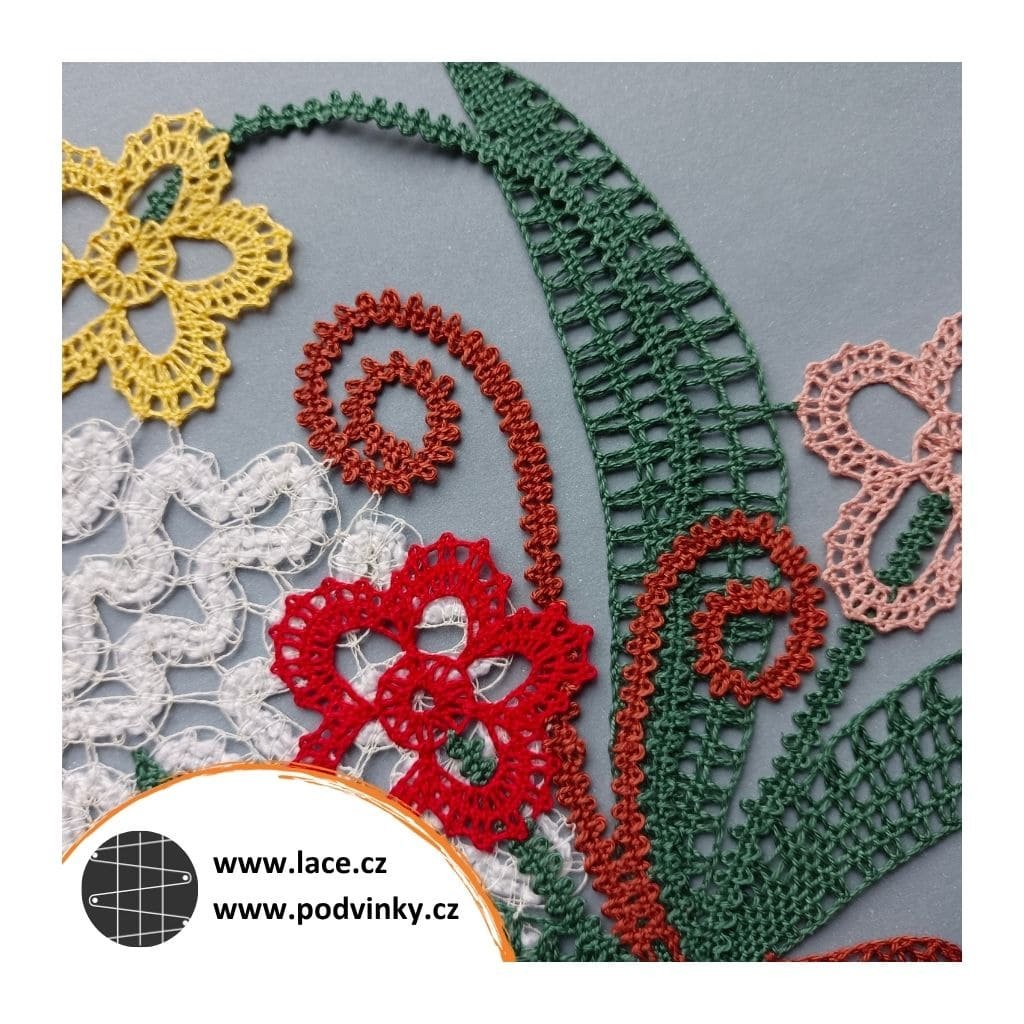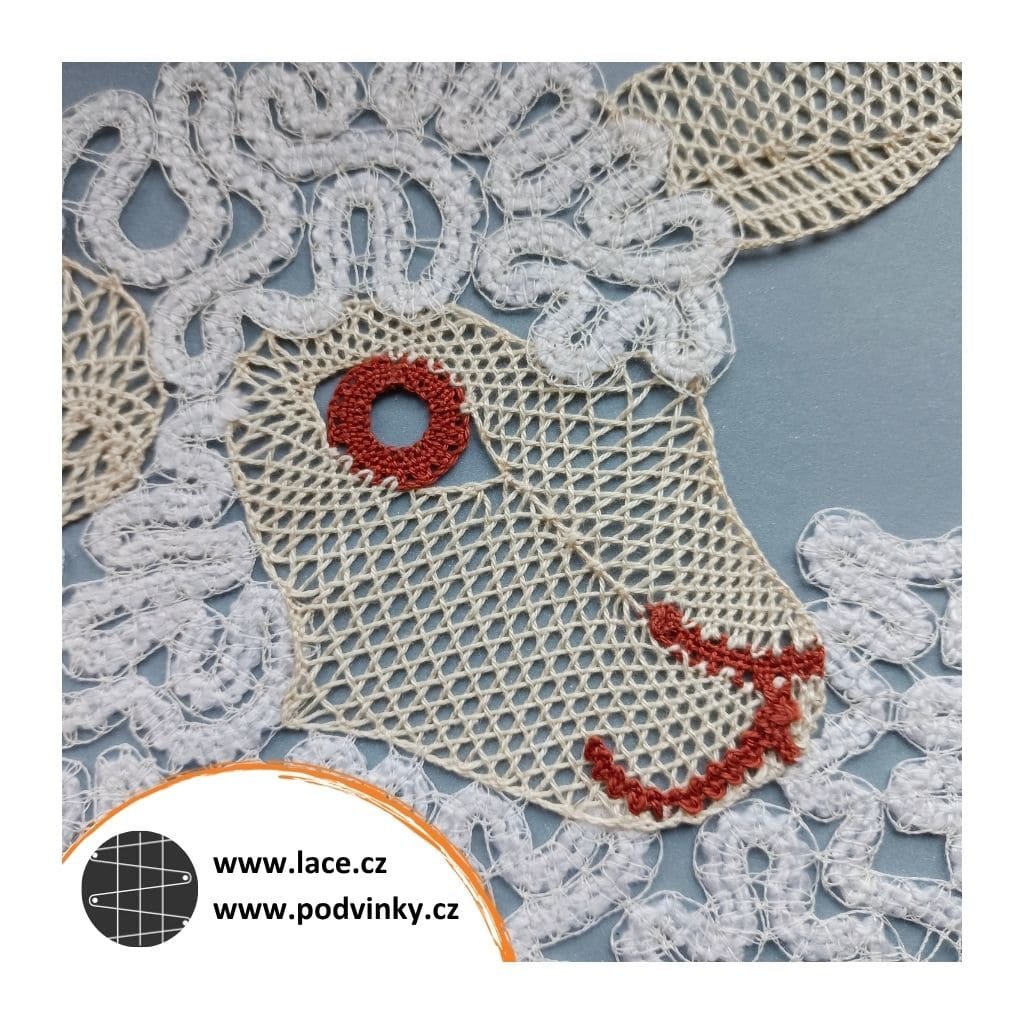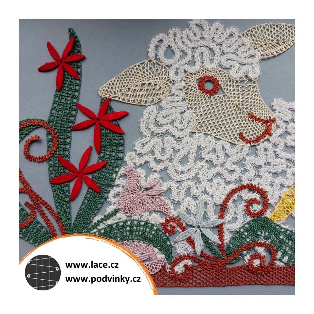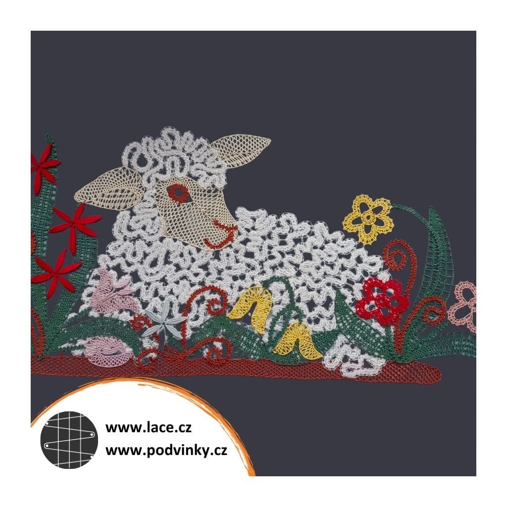 Podvinek na paličkování: Beránek na jarní louce. Převážně pásková krajka, paličkovaná v několika vrstvách.