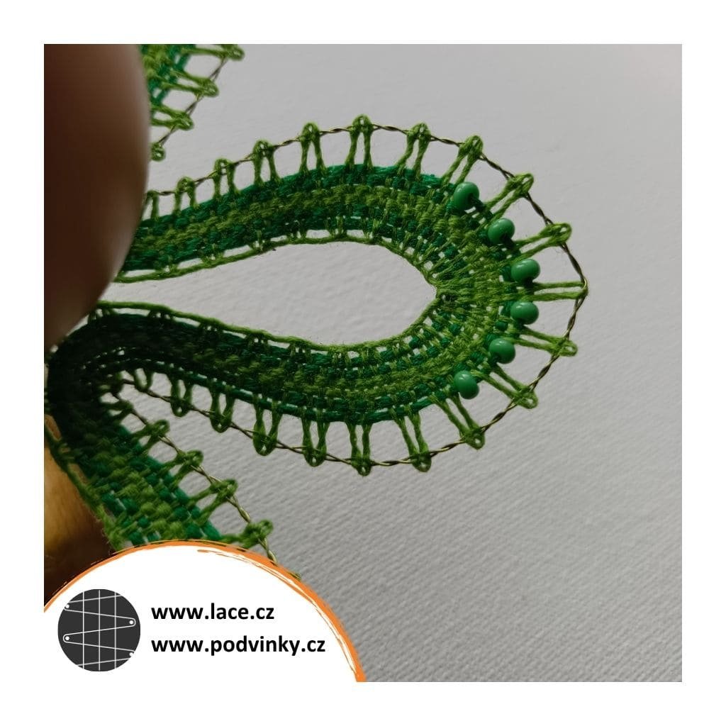Podvinky na paličkování: Růžice upaličkovaná v jednom tahu, zdobená drobnými skleněnými korálky, vytvarovaná díky měděnému drátku ve vnějším okraji. Zbytek krajky je upaličkovaný z mulinky.
