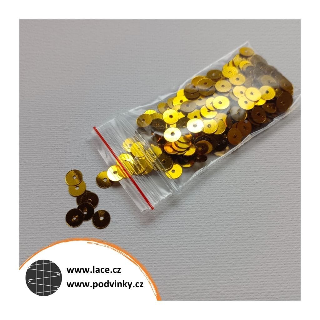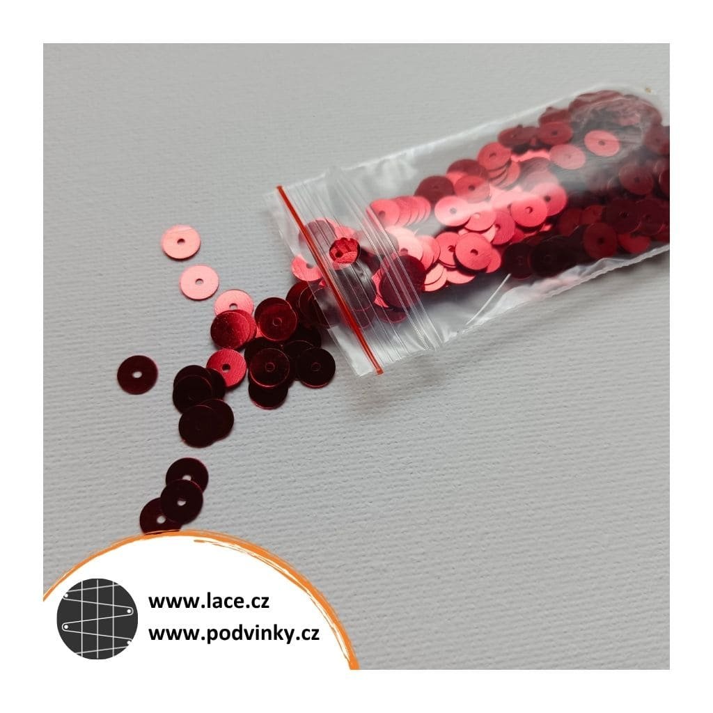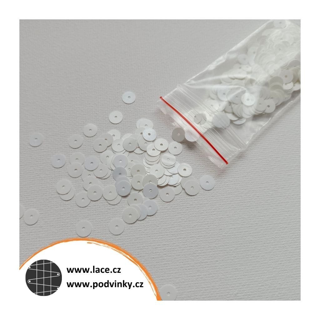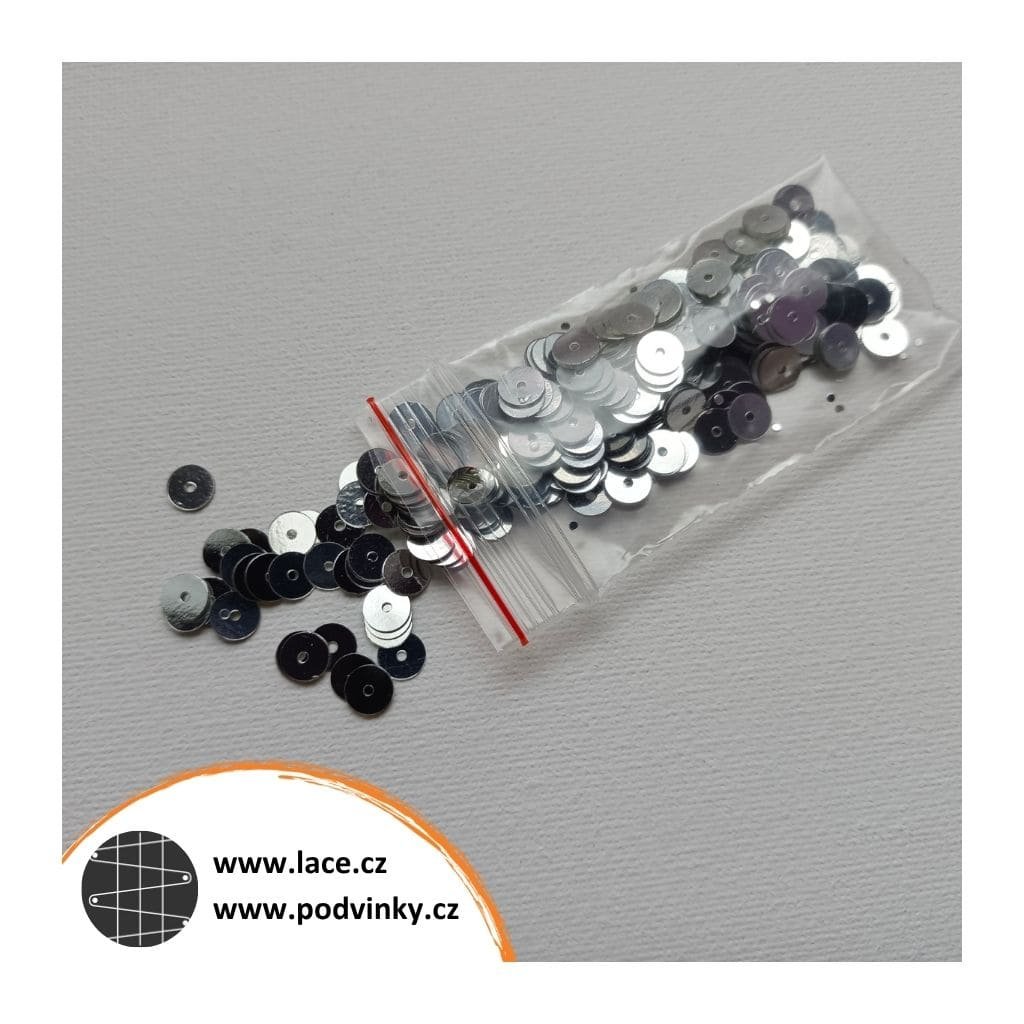 Plastové flitry kulatého tvaru, s dírkou uprostřed. Průměr asi 5 až 6 mm, různé barvy. V každém balíčku je přibližně 5 g flitrů.