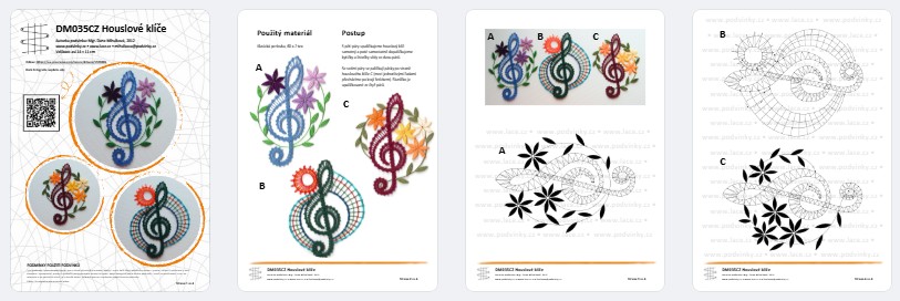 Podvinky na paličkování tří houslových klíčů z páskové krajky, zdobených lístečky. Výška každého houslového klíče je asi 14 cm, šířka asi 11 cm.