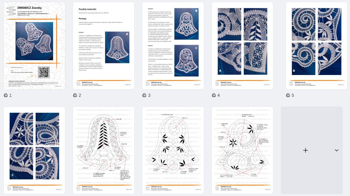 Podvinky na paličkování tří houslových klíčů z páskové krajky, zdobených lístečky. Výška každého houslového klíče je asi 14 cm, šířka asi 11 cm.