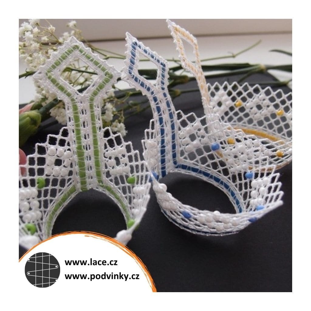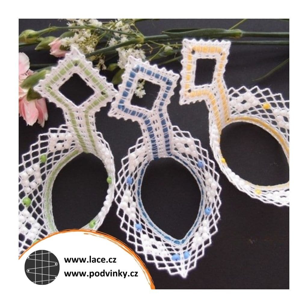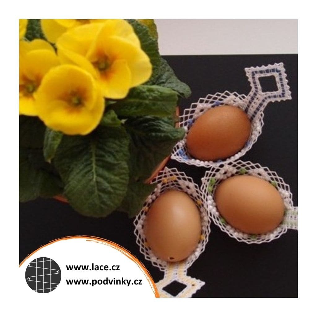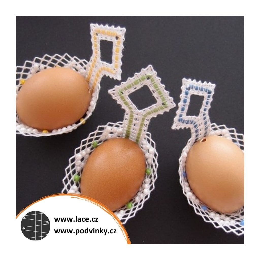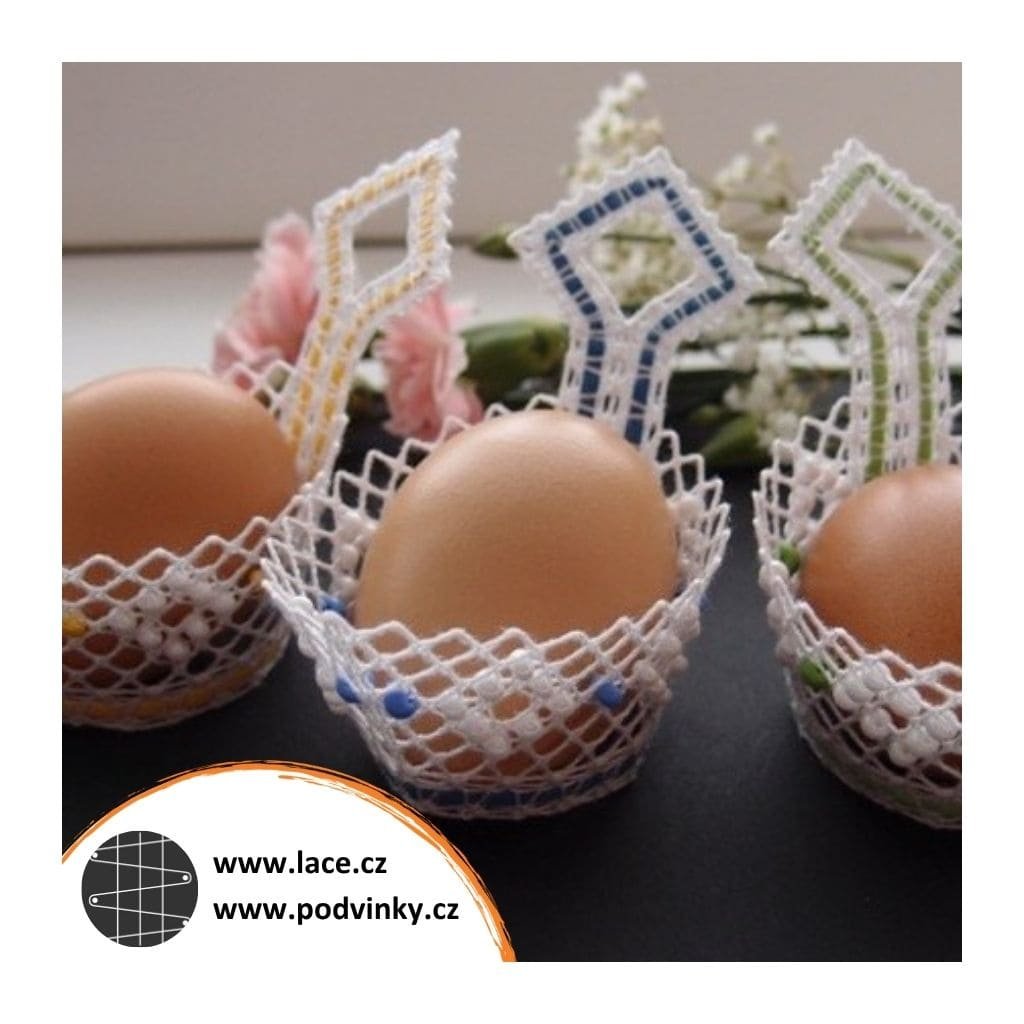 Podvinky na paličkování: Košíčky na vajíčka z dírkové půdice zdobené ještě skleněnými korálky (rokailem). Je v nich zapaličkovaná barevná stuha v podobě umělého lýka. Paličkuje se naplocho, po odšpendlení se krajka sešije a tím získá svůj tvar.