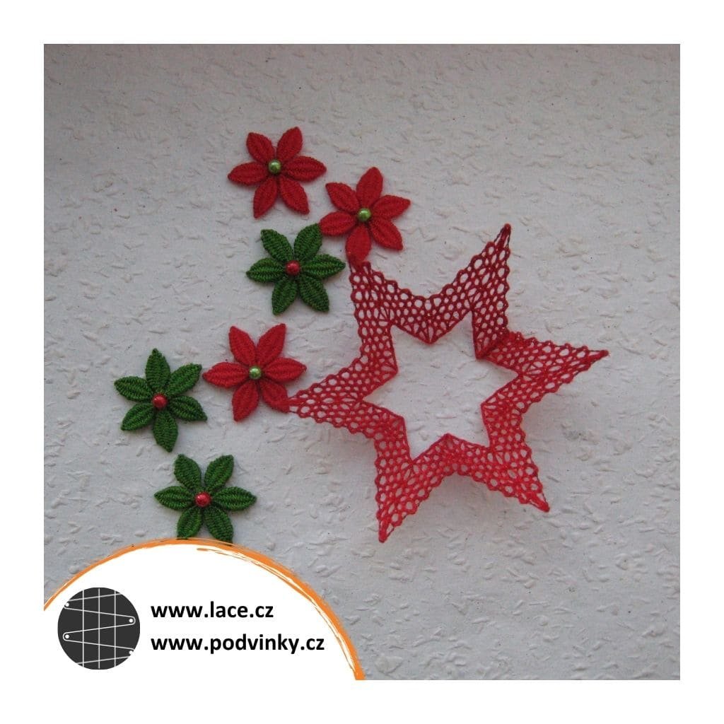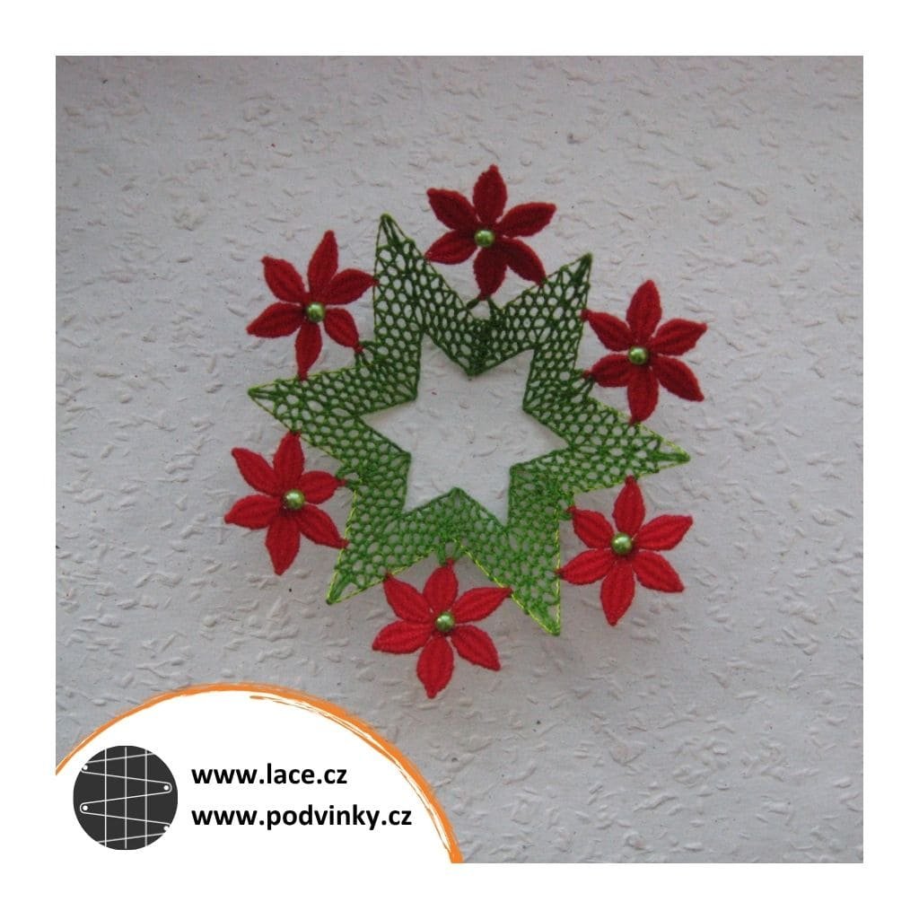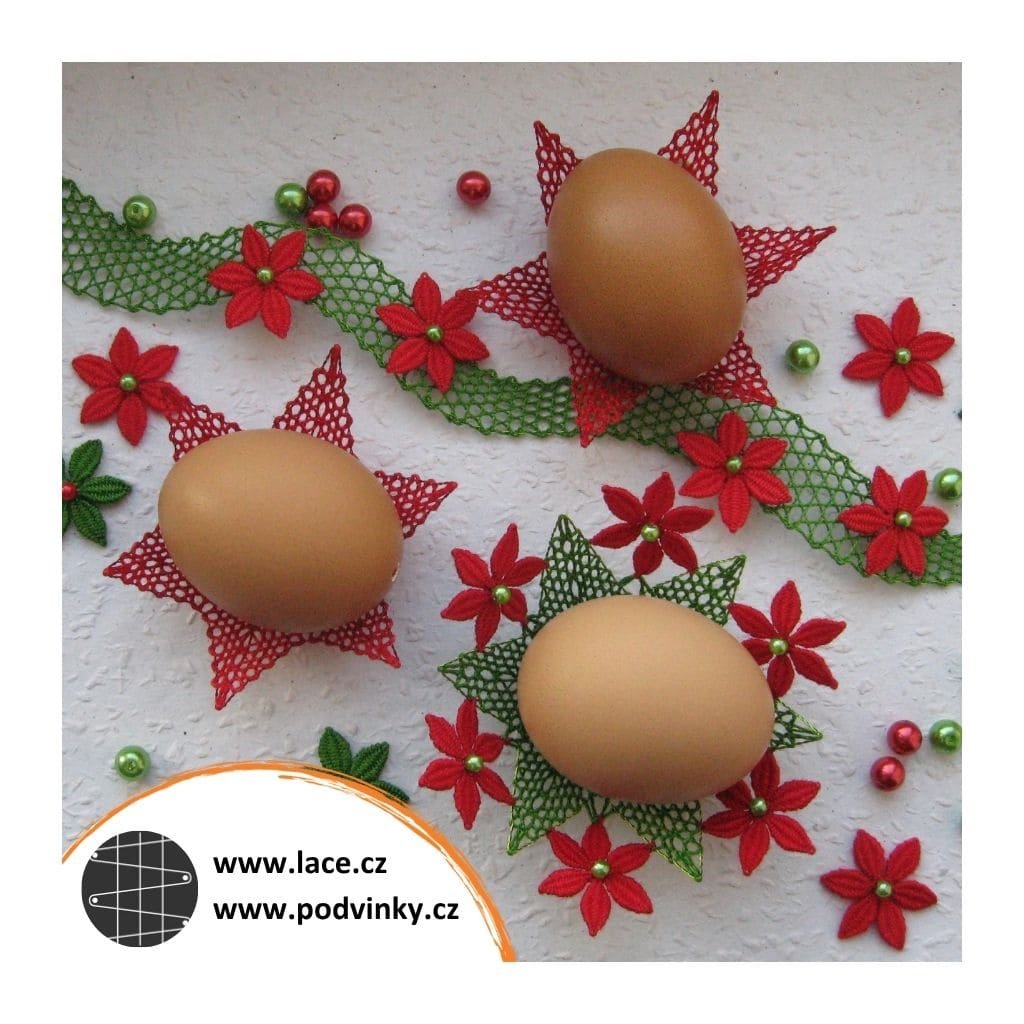 Podvinky na paličkování: Hvězdička zdobená růžicemi z lístečků (z much), sešitá a vytvarovaná jako košíček na kraslici. Růžice z lístečků lze také vynechat. Další možností je upaličkování kompletní hvězdičky, s přidáním středové růžice. Celou sadu doplňují zvlněné pásky z polohodu, na které lze našít libovolný počet samostatně upaličkovaných růžic z lístečků.