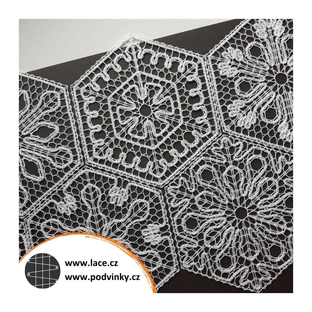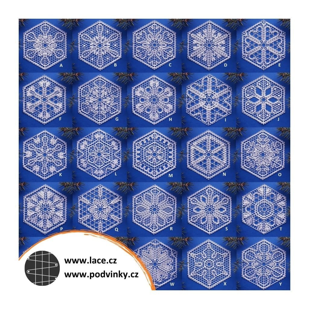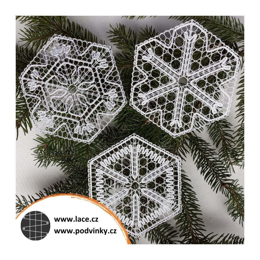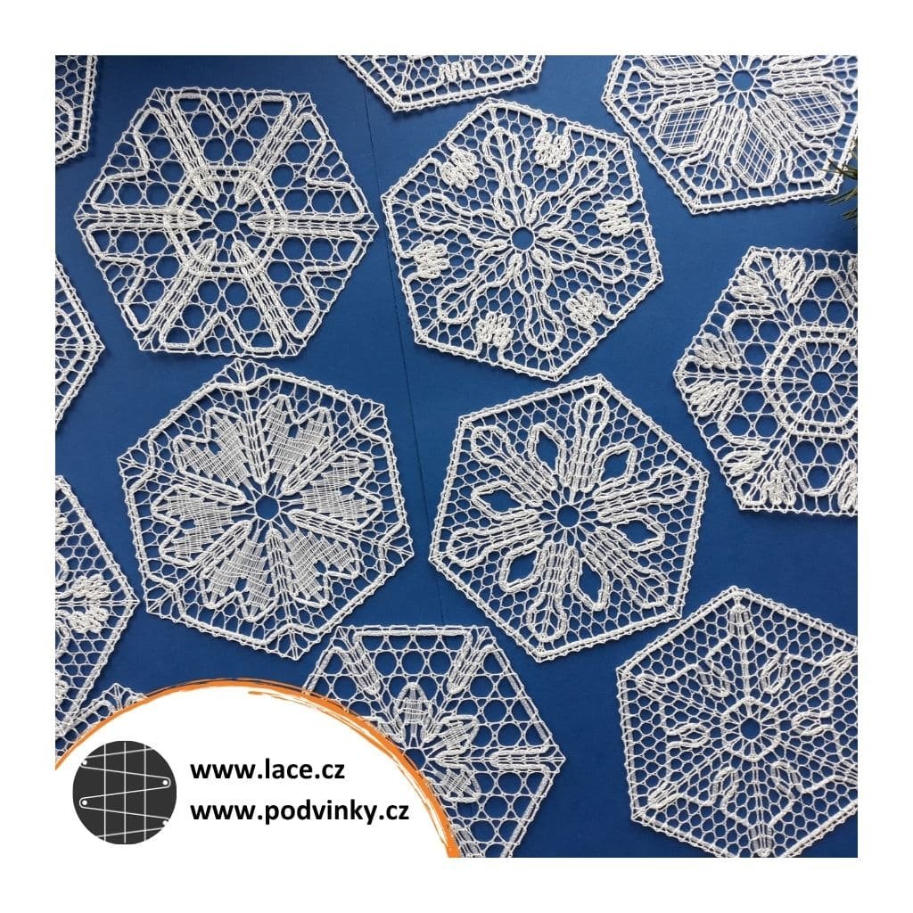 Podvinky na paličkování: Sada 25 podvinků – ledové krystaly ve tvaru šestiúhelníku. Všechny mají stejnou velikost (průměr 11 cm), stejný tvar a všechny se paličkují se 12 páry paliček (plus obtahovačky). Po zmenšení lze na stejných podvincích upaličkovat filigránské náušnice.