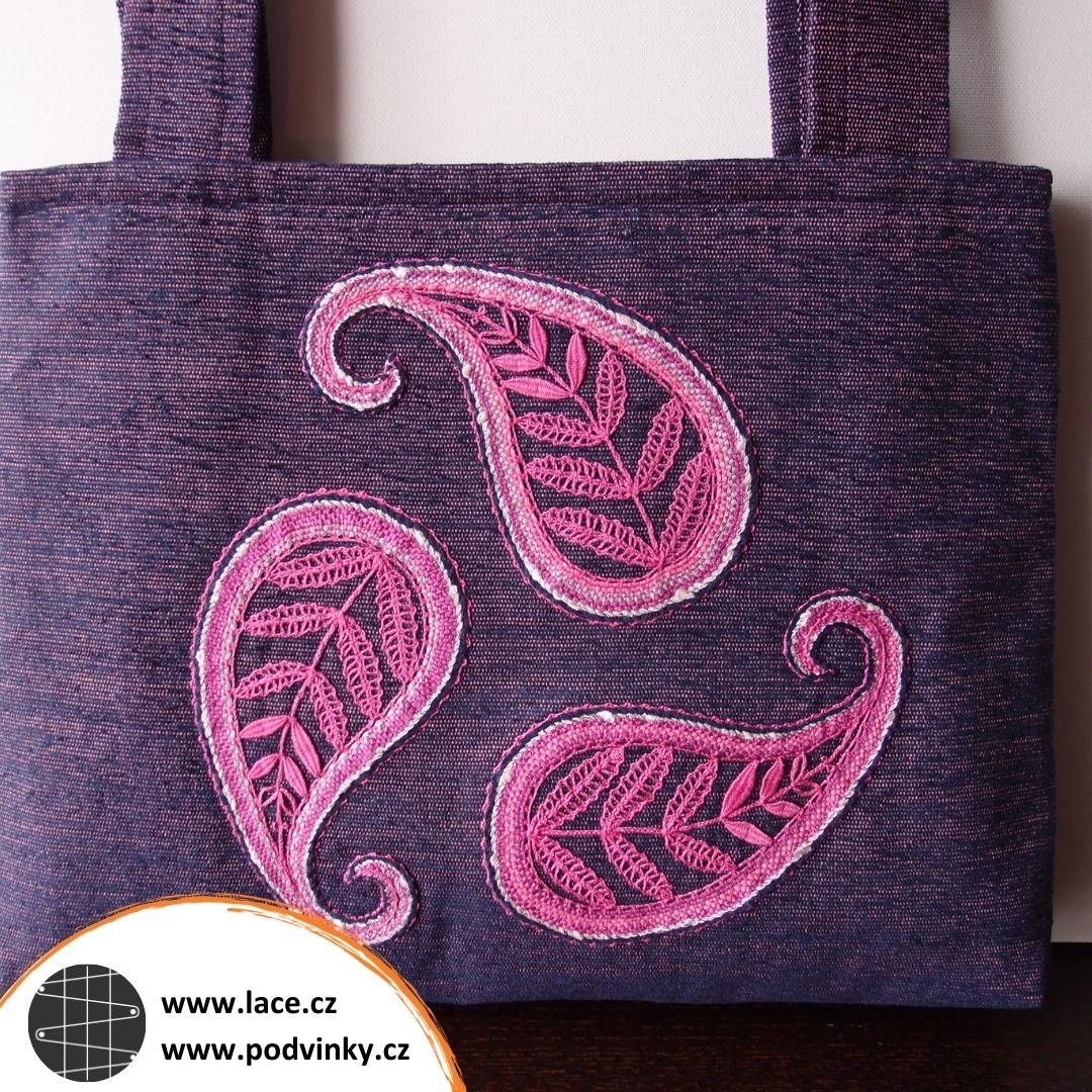 Chápu, že to zní šíleně, ale stalo se. Na soutěž v italské Gorizii jsem chystala tři kapkovité motivky (paisley), které jsem chtěla našít na kabelku. Tu jsem ušila z takové silnější potahové látky, ze které jsem vypárala kousek tmavě modré žinylky, která tvořila útek této tkaniny. Žinylku jsem zapaličkovala do krajky a k ní jsem přidala několik dalších přízí, tak aby barevně ladily s tou látkou. Použila jsem také jednu buklé pletací přízi.