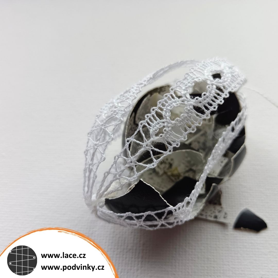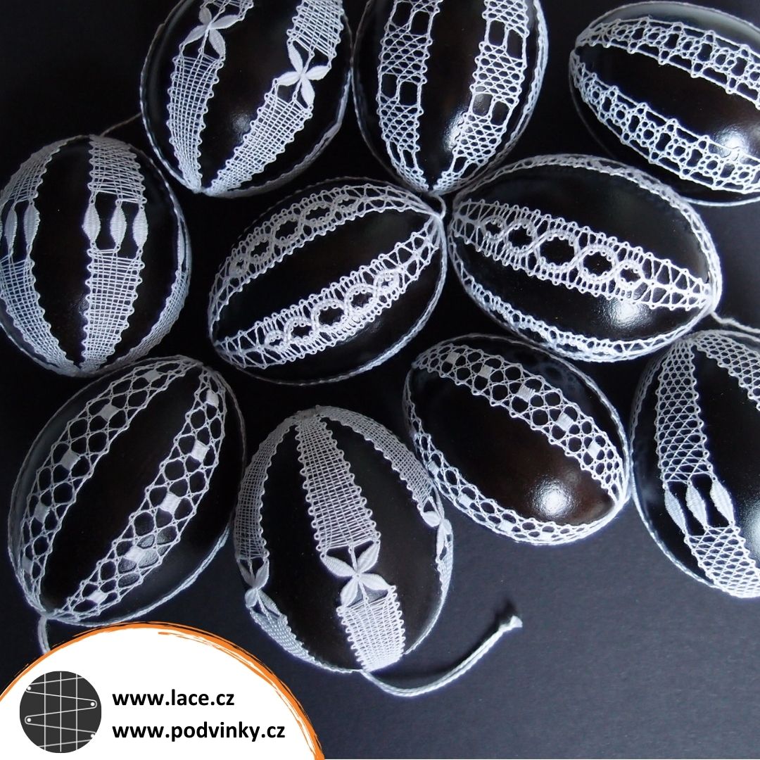 Ano, bohužel, zavrhla jsem plast, to mám za to. Tato sada velikonočních vajíček je mezi krajkářkami velmi oblíbená. Mám je v e-shopu sice pojmenované jako Černobílé kraslice, ale stejnou sadu jsem upaličkovala i s modrým podkladem. Použila jsem vyfouknuté skořápky obyčejných slepičích vajec. Nedávno jsem si chtěla tyto kraslice znovu nafotit – a stalo se. Jedna ze skořápek se mi rozsypala v ruce. Naštěstí až po vyfocení.