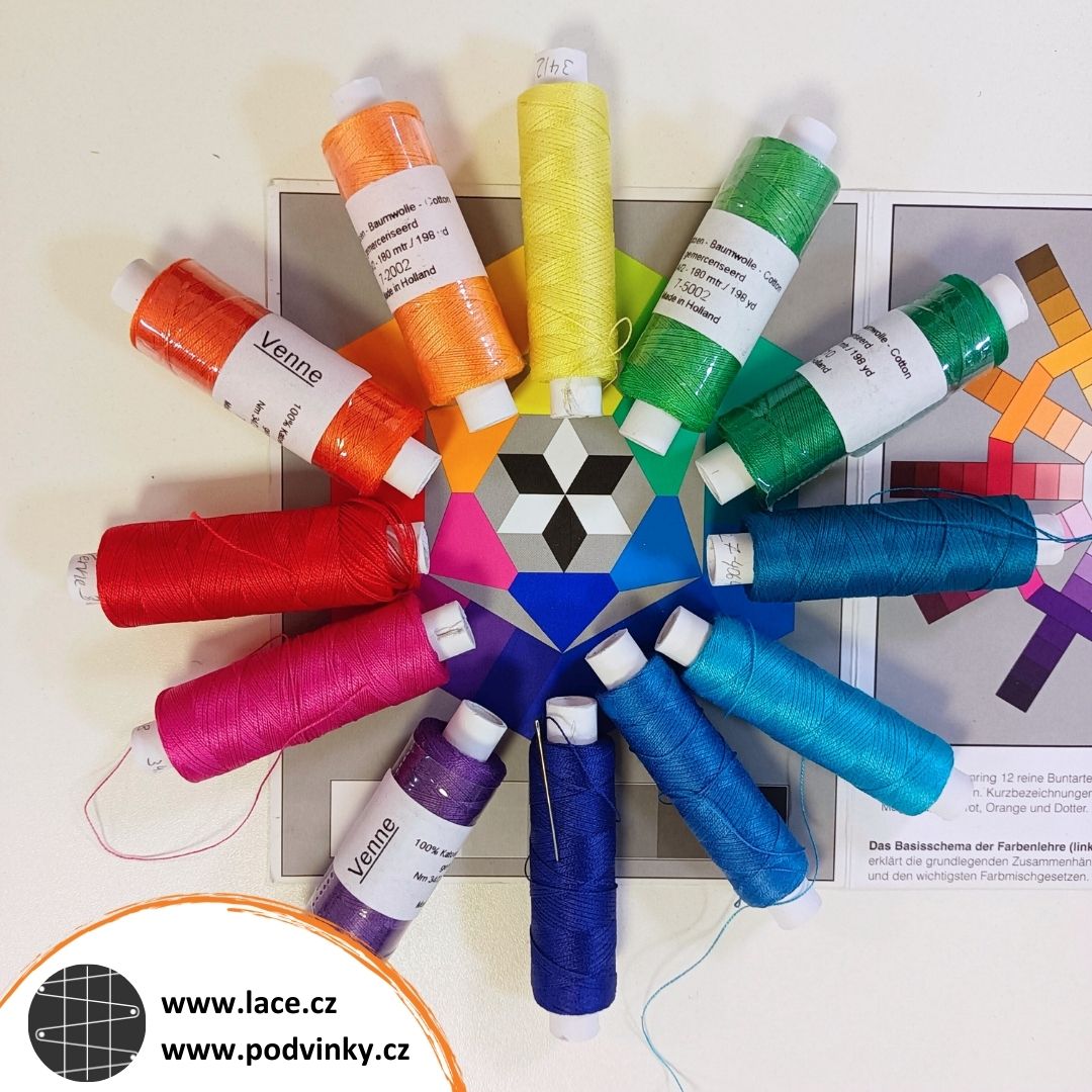 Tohle je dost nemilá věc. V rámci studia v Německu jsem si během jednoho z kurzů navrhla určitou kompozici podle zadání. Byly mi přiděleny dvě barvy, ze kterých jsem měla krajku upaličkovat, červená a tyrkysová. V kurzech jsme po celou dobu pracovaly s bavlněnými nitěmi Venne ve 12 odstínech, které měly odpovídat tzv. Küppersově barevnému kompasu (na obrázku). Můj návrh sestával z pěti kapkovitých prvků a při paličkování třetího mi moje tyrkysová začala docházet. Měla jsem informaci o tom, jaké číslo barvy by to mělo být, ale když jsem zabrousila do e-shopu, našla jsem pod stejným číslem odstín, který byl zjevně úplně jiný. Když jsem hledala podle názvu, těch „tyrkysových“ (psáno německy, francouzsky i kdovíjak jinak) tam bylo mnohem víc. Barvy na monitoru vypadají jinak než ve skutečnosti, jak známo. Šance zakoupit stejné nitě osobně byla v době covidu nulová, takže jsem podle svého nejlepšího vědomí a svědomí jednu cívku objednala. No a když dorazila, nestačila jsem se divit, jak moc se liší od té, kterou jsem potřebovala. Jestli byla chyba v čísle, nebo bylo číslo správně a lišily se jen šarže, to už se nedozvím.