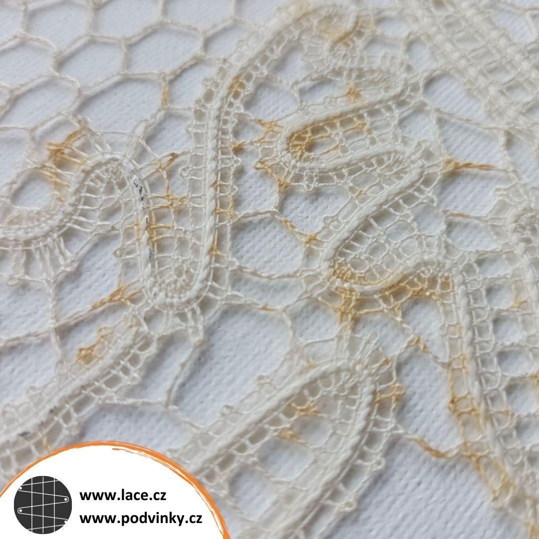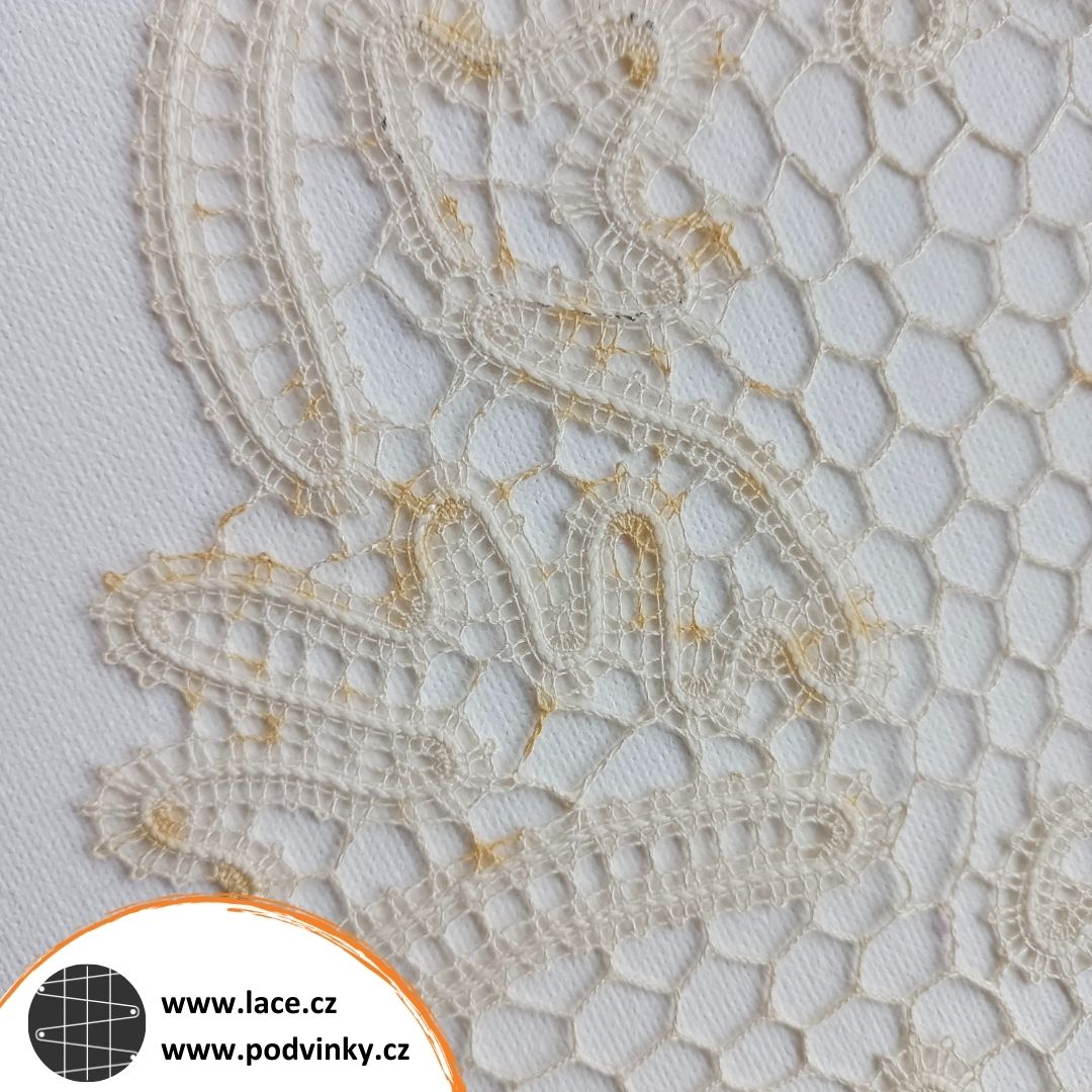 Příčinu toho, co se stalo, vlastně neznám. Mám jen podezření, že se jedná o cosi jako polétavou rez. Krajku jsem paličkovala někdy v polovině devadesátých let, měla jsem ji několik měsíců na stolečku v obýváku (pod sklem). Jakmile se narodila dcera, sklo jsme schovali a dečka skončila v krabičce ve skříni. Když jsem ji teď, po téměř 30 letech vytáhla, nestačím se divit, jak je flekatá. Není to jediný kousek, na kterém jsem něco takového našla u sebe, a viděla jsem podobný problém i na cizích krajkách, dokonce i na výstavách.