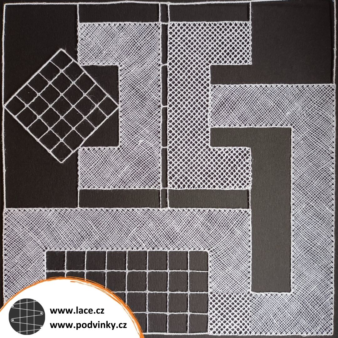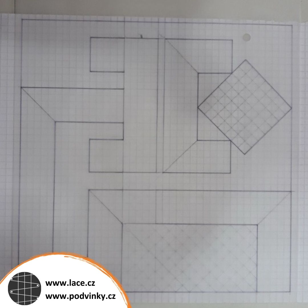 Tato chyba není na první pohled vidět. Jedná se o návrh z kurzu Tvary, kde jsme měli zadaný určitý počet prvků, které bylo potřeba nějak uspořádat do prostoru o velikosti 20 × 20 cm. Kreslila jsem tedy na čtverečkovaném papíře. Doma jsem si pak chtěla podvinek nakreslit ještě přesněji, aby mi u toho šikmého plátna pěkně vycházelo píchání, zpracovala jsem si ho tedy znovu v programu knipling. Vše šlo dobře, až na to, že jsem při tisku ponechala výchozí okraje 1 cm na každé straně. Můj podvinek pak měl rozměr 19 × 19 cm, což jsem bohužel zjistila až po dokončení krajky. Odchylka prostě nebyla tak velká, aby bila do očí. Takže znovu...