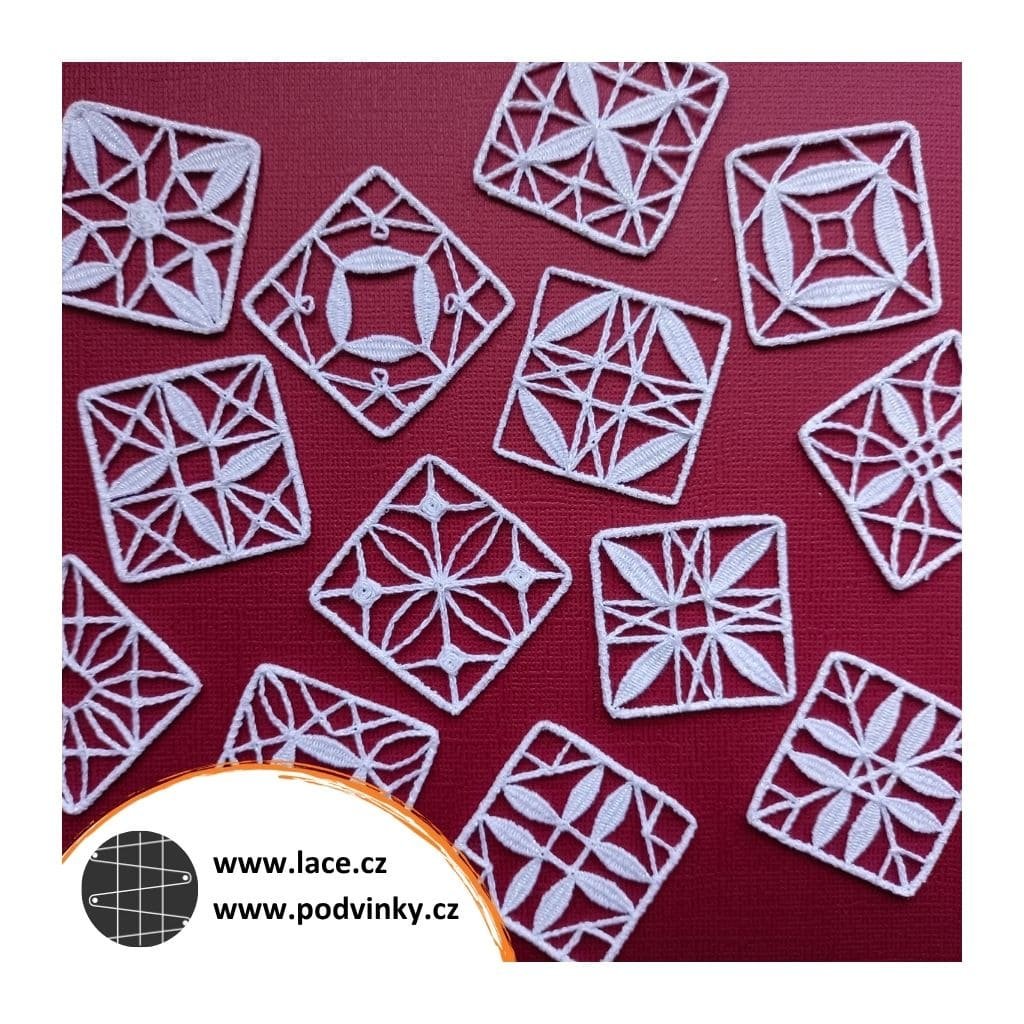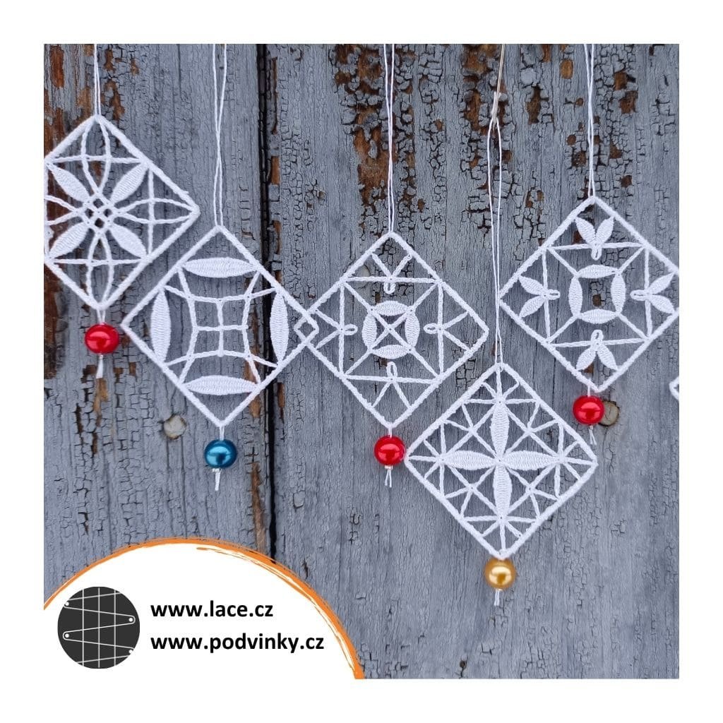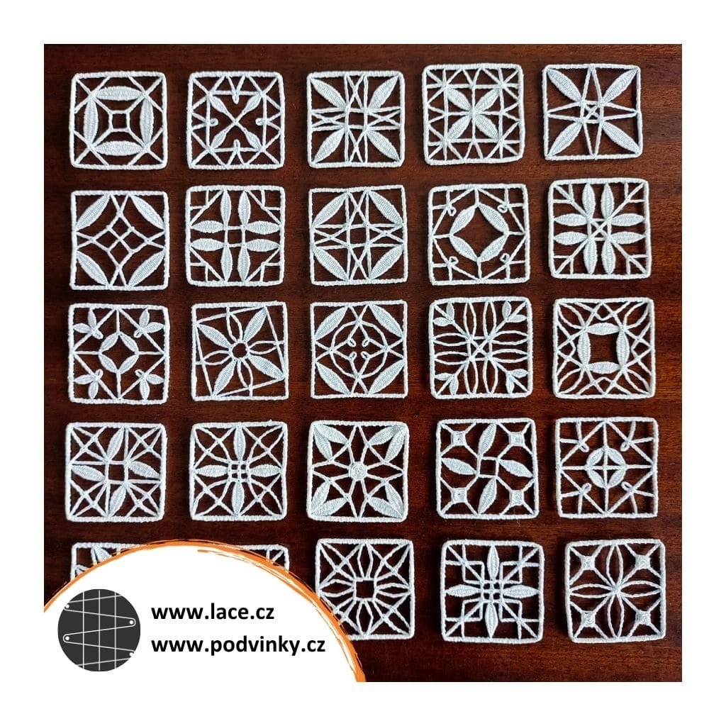 Soubor 25 podvinků pro paličkování se dvěma páry – čtverečky o velikosti 3,5 × 3,5 cm. Ze čtverečků jsou poskládané některé další tvary jako proužky, křížky, přívěsky a podobně. Čtverečky jsou tentokrát upaličkované z trochu silnějších nití, jsou krásně stabilní a díky bílé barvě hezky vynikají na stromečku, v oknech a v girlandách. Můžete si z nich vytvořit slušivé náušnice, můžete je nalepit na přáníčka – a jistě sami najdete řadu dalších použití. K upaličkování stačí dva páry paliček, nicméně pro dokončení (obháčkování) je potřeba použít o něco tenčí niť ve stejné barvě.
